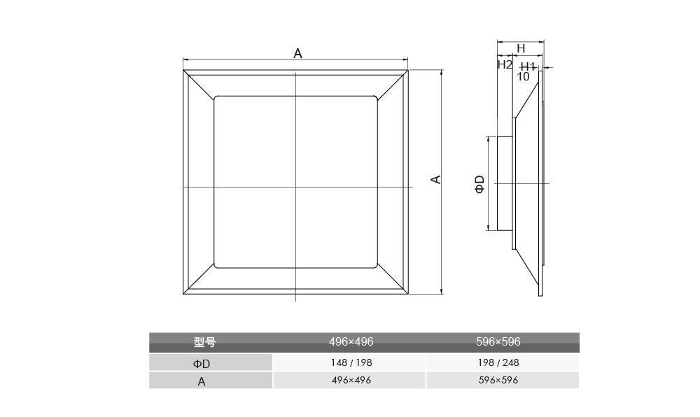 與風管連接外徑尺寸(mm) (Φ148、Φ198、Φ248)