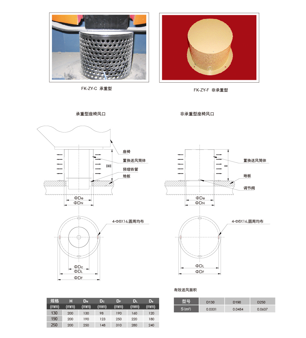 示例:FK-ZY/C/130表示直徑為130mm承重型座椅風(fēng)口。