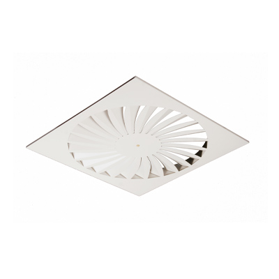 風(fēng)口由固定式徑向排列的導(dǎo)流葉片組成,具有風(fēng)量大而噪聲小的特點,出風(fēng)形式為水平旋流送風(fēng),誘導(dǎo)比高,送風(fēng)與室內(nèi)空氣迅速混合,因而溫度和風(fēng)速可迅速下降,達(dá)到很高的室內(nèi)舒適性,送風(fēng)溫差可±10K。