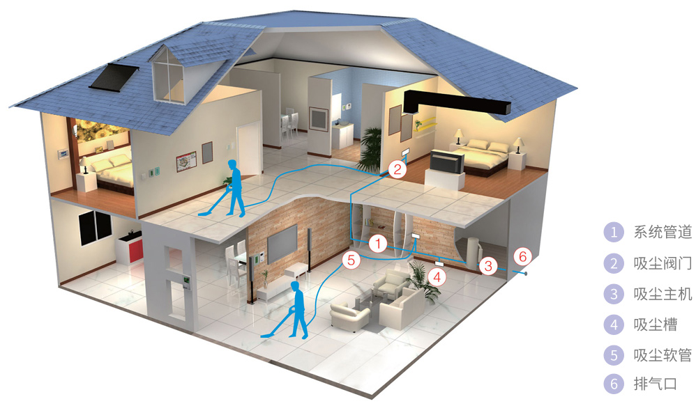 中央除塵系統(tǒng)也叫中央吸塵系統(tǒng)。由吸塵器主機(jī),吸塵管道,吸塵插口,吸塵組建組成。吸塵主機(jī)置于室外或者建筑物的機(jī)房,陽臺(tái),車庫,設(shè)備間內(nèi)。主機(jī)通過嵌置墻里的吸塵管道與每個(gè)房間的吸塵插口相連接,連接在墻外只留如普通電源插座大小的吸塵插口,在進(jìn)行清潔工作時(shí)將一根較長的軟管插入吸塵插口,灰塵,紙屑,煙頭,雜物及有害氣體通過嚴(yán)格的密封真空管道,將灰塵吸到吸塵器主機(jī)的垃圾堆中。任何人,任何時(shí)間都可以進(jìn)行全部或局部清潔,操作簡(jiǎn)單,方便,避免了灰塵帶來的二次污染及噪音的污染,確保了最清潔的室內(nèi)環(huán)境。